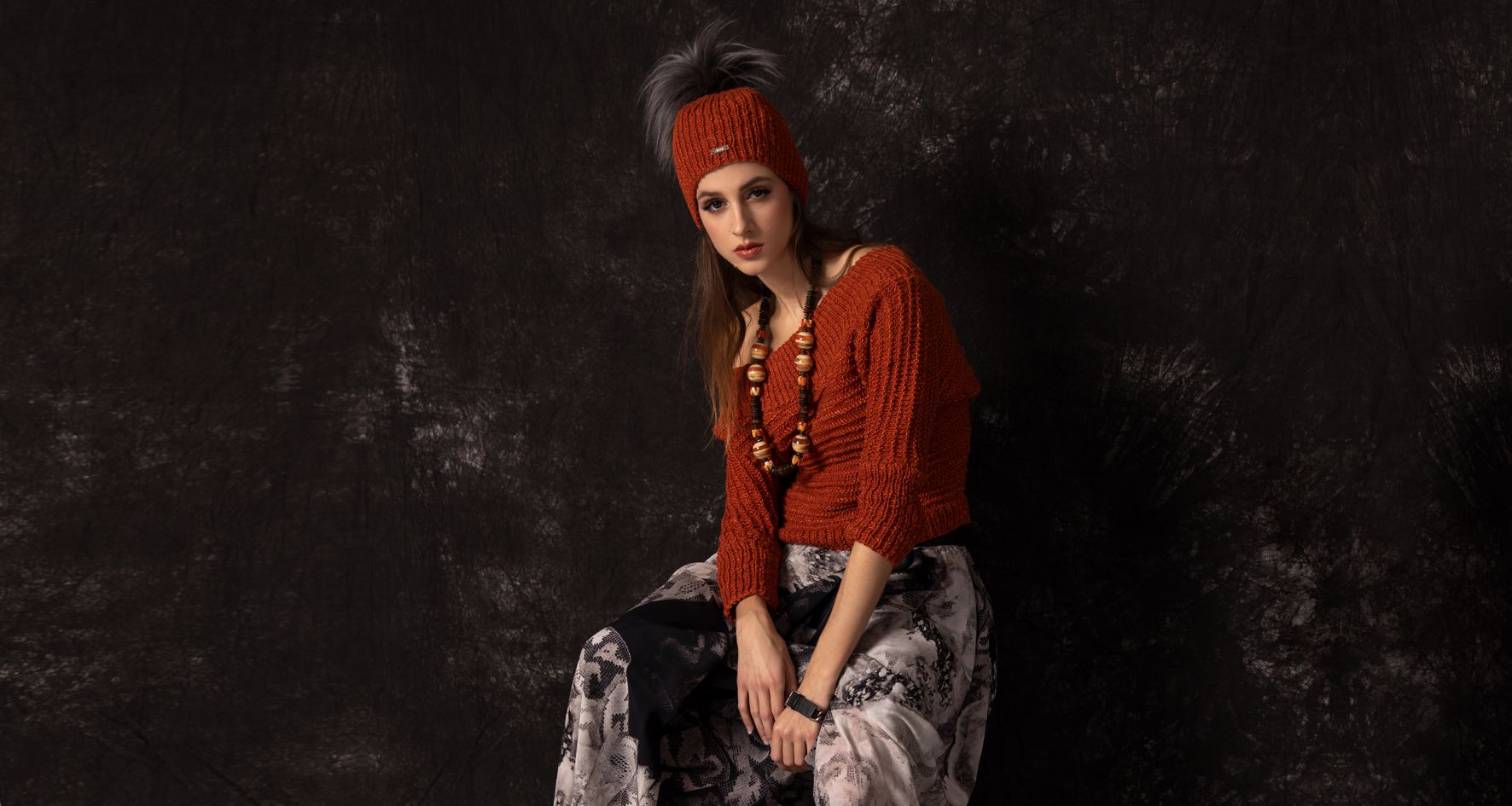 97% wełna, 3% elastan; 100% skóra naturalna; 97% poliester, 3% elastan