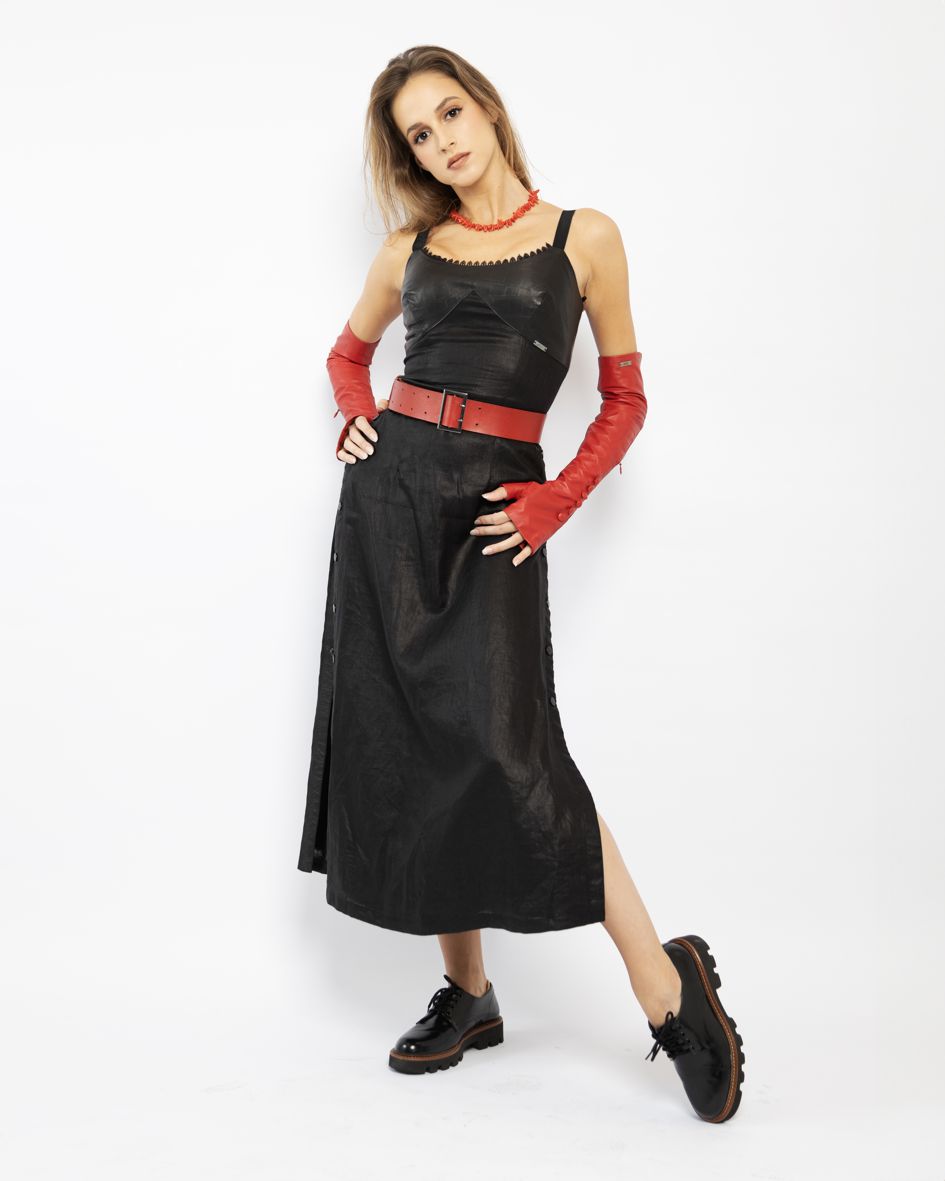 Minimalistyczna, lekko rozszerzona sukienka na ramiączkach – to połączenie czerni i kontrastujących ze sobą tekstur. Sukienka wykonana z lnu z subtelną poświatą oraz skóry naturalnej z delikatnym tłoczeniem krokodylim. Mimo prostego kroju sukienka jest bardzo wyrazista i bardzo seksowna. Odważne, rozpinane rozporki na bokach – to propozycja dla zdecydowanych, pewnych siebie kobiet, które chętnie wyeksponują swoje zgrabne nogi. Rewelacyjna na ciepłe dni na co dzień. Doskonale będzie się komponować zestawiona z naszymi skórzanymi szortami i butami typu glany czy rzymianki.