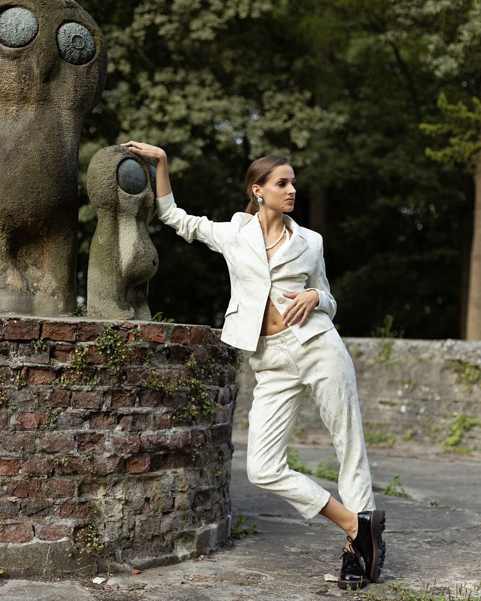 • spodnie z elementami ze skóry naturalnej w kolorze śmietankowym