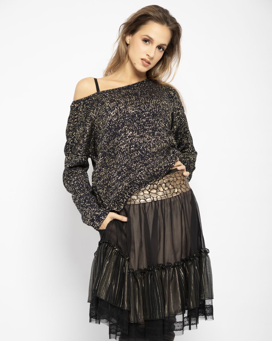Jeden z naszych ostatnich bestsellerów – zjawiskowa spódnica z podwójną falbaną i kontrastowym karczkiem ze skóry – to połączenie, które z pewnością skradnie Wasze serca. Neutralna paleta czerni wraz z prześwitującym beżem i złotym akcentem na karczku – to klasyka i ponadczasowa elegancja. Całość idealnie dopełni cekinowy top, sweter czy skórzana ramoneska. Do tego oczywiście botki lub glany.