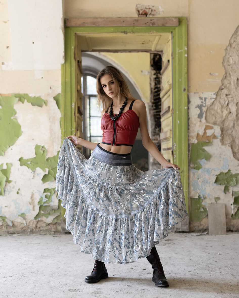 Nasza urocza spódnica maxi inspirowana stylem boho-chic – wykonana została z marszczonych falban w kolorze szarym z szyfonu jedwabnego z brokatem. Detale w postaci naszytych, wzdłuż bioder i falban, ozdobnych tasiemek nadają jej unikalnego i nieco hippisowskiego charakteru. Stylizacja uzupełniona odpowiednimi dodatkami z pewnością zagwarantuje bardzo oryginalny, nietuzinkowy outfit. Znakomicie będzie się komponować z naszą kurtką z frędzlami w kolorze szaro-srebrnym i torebką w stylu boho. Spódnica idealna na co dzień oraz wszelkie uroczystości rodzinne.