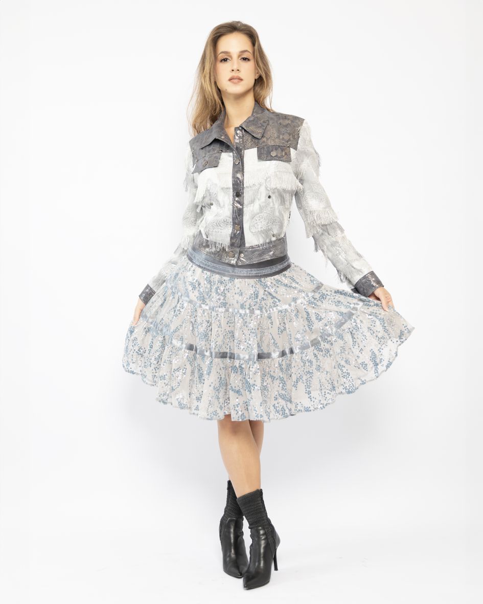 Nasza urocza spódnica inspirowana stylem boho-chic – wykonana została z marszczonych falban w kolorze szarym z szyfonu jedwabnego z brokatem. Detale w postaci naszytych, wzdłuż bioder i falban, ozdobnych tasiemek nadają jej unikalnego i nieco hippisowskiego charakteru. Stylizacja uzupełniona odpowiednimi dodatkami z pewnością zagwarantuje bardzo oryginalny, nietuzinkowy outfit. Znakomicie będzie się komponować z naszą kurtką z frędzlami w kolorze szaro-srebrnym i torebką w stylu boho. Spódnica idealna na co dzień oraz wszelkie uroczystości rodzinne.